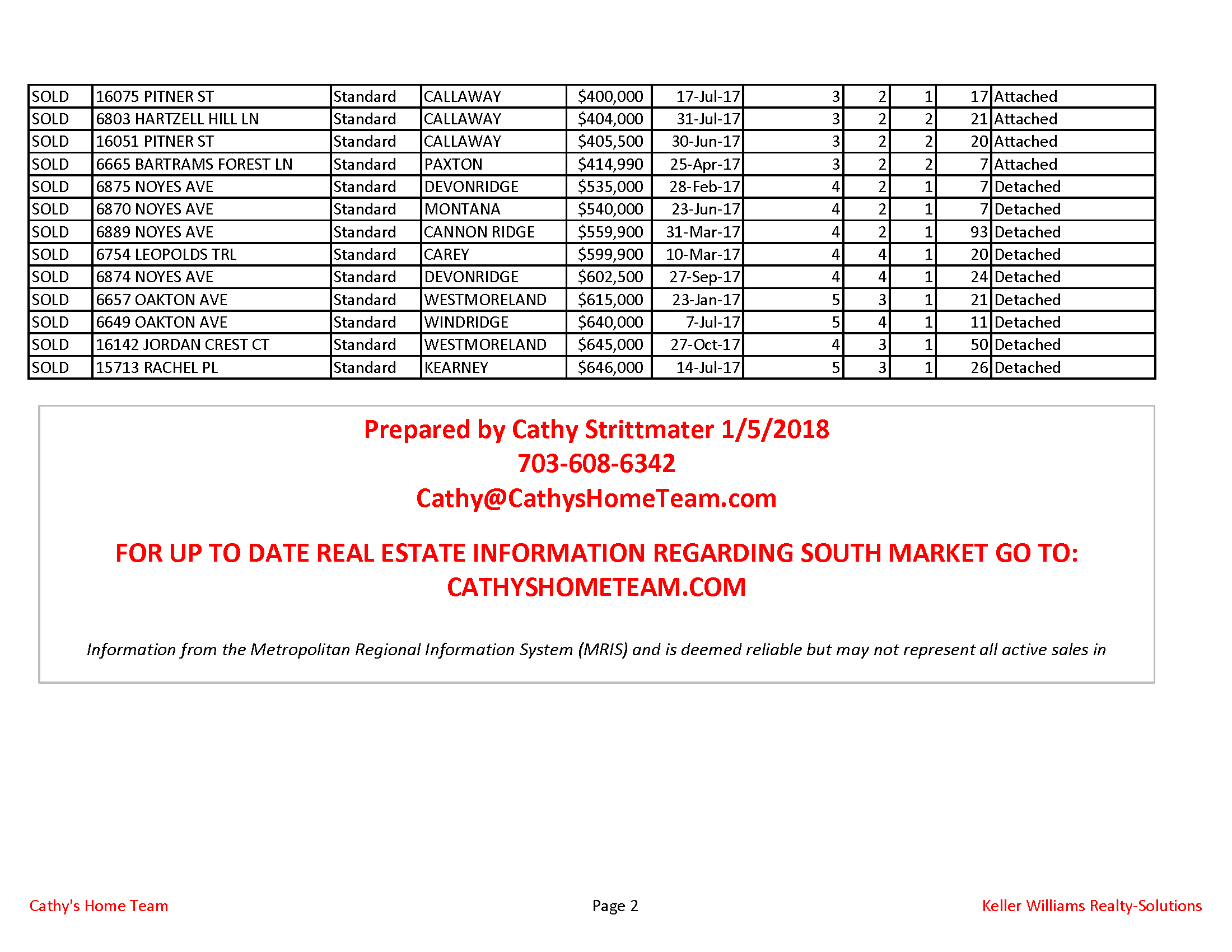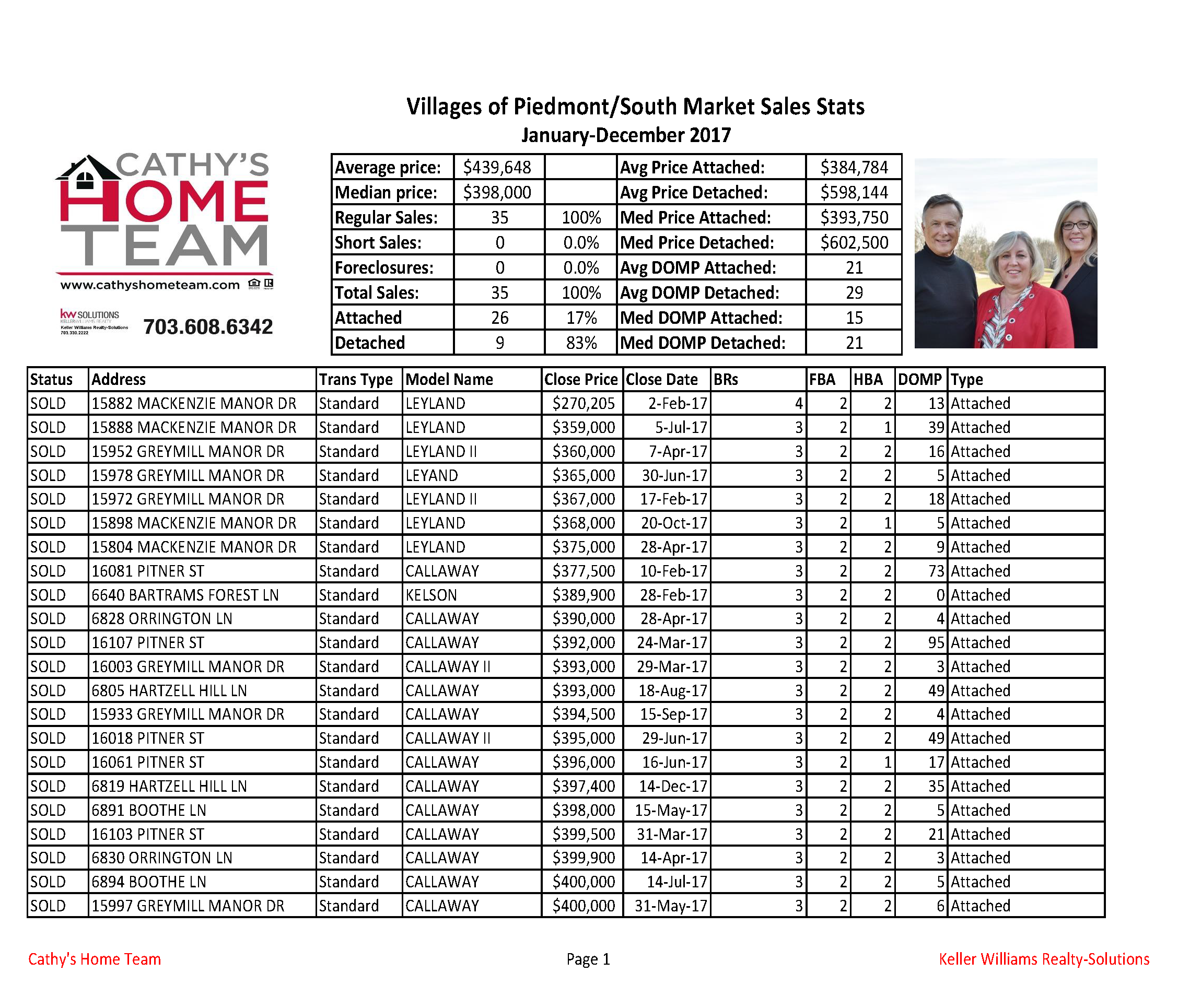 Below are the stats for Villages of Piedmont (South Market) Home re-sales for 2017. Volume of sales was up slightly between 2016 and 2017 — 31 homes in 2016 and 35 sold in 2017. The attached homes are the only stats with a large enough sample to draw a year over year analysis. 26 townhomes sold in 2017 while 25 sold in 2016. The median sales price for townhomes rose approximately 3% over 2016. Single family homes only saw nine sales last year. There is not enough data of single family sales to draw a valid analysis. We also only included re-sale home data since not all of the new construction homes sales are inputted in the MLS system.