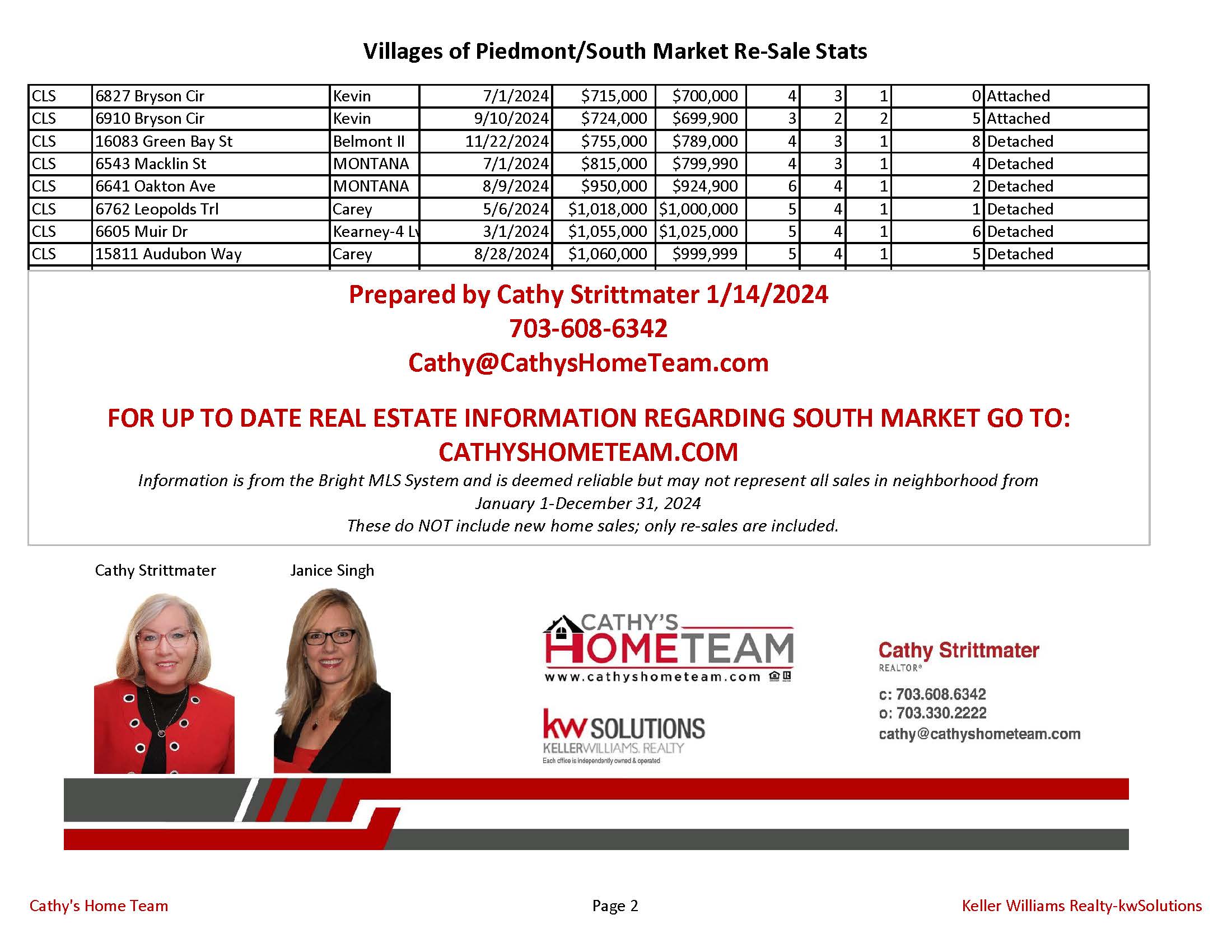 There were only six detached homes that sold in Villages of Piedmont last year so this rise in appreciation is somewhat skewed since there were such a low number of home sales. Overall in Western Prince William County in the neighborhoods we analyze, there was a rise in home values of like/kind properties. Cathy’s Home Team believes that the rise in value is valid for Villages of Piedmont also.
